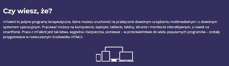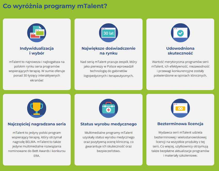 mTalent to seria multimedialnych programów edukacyjno-terapeutycznych opracowanych przez specjalistów z dziedziny pedagogiki, logopedii i terapii. Programy te zawierają tysiące interaktywnych ćwiczeń, które można łatwo zintegrować z zajęciami dydaktyczno-wyrównawczymi, rewalidacyjnymi, logopedycznymi oraz korekcyjno-kompensacyjnymi. Dzięki temu stanowią one wszechstronne narzędzie wspierające rozwój dzieci na różnych etapach edukacji.