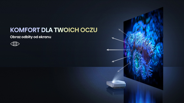 Niezwykłą zaletą projektora jest oglądanie obrazu odbitego od ekranu. Dzięki korzystaniu z Hisense Laser Cinema PX2-PRO można swobodnie cieszyć się pięknym, dużym obrazem bez zmęczenia oczu, nawet podczas długich seansów.