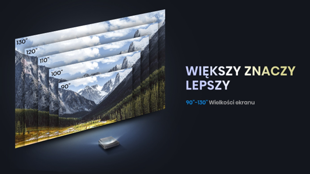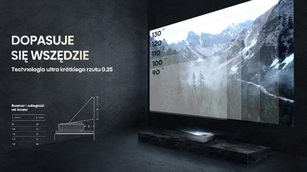Projektor ultrakrótkiego rzutu pozwala cieszyć się jasnym i pełnym kolorów obrazem 4K nawet w rozmiarze 130”. Samo urządzenie pozostaje w niewielkiej odległości od ściany lub ekranu. A Ty cieszysz się obrazem, który wypełnia przestrzeń, kinowymi wrażeniami w domu.
