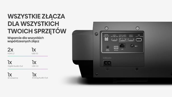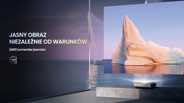 2400 Lumenów jasności* w połączeniu z dobrym ekranem projekcyjnym* absorbującym światło pozwala cieszyć się jasnym, żywym obrazem z projektora Hisense Laser Cinema niezależnie od warunków oświetleniowych w pomieszczeniu. Ciesz się dużym ekranem w swoim salonie, ciesz się kinem w domu.