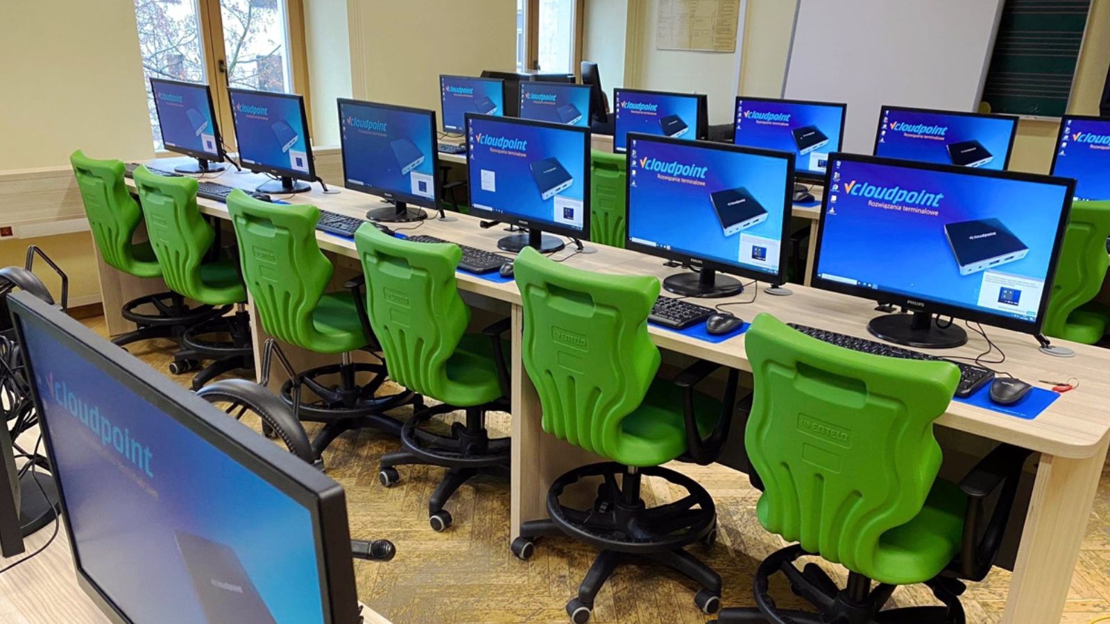 Pracownia językowa z terminalami vCloudPoint to unikatowe rozwiązanie dla szkół. Łączy zalety pracowni terminalowej oraz językowej. Dzięki zastosowaniu rozwiązań do nauki języków obcych oraz wyposażeniu każdego ucznia w terminal, zyskujemy jedyne w swoim rodzaju narzędzie wspierające proces nauki języka w liczebnych klasach.