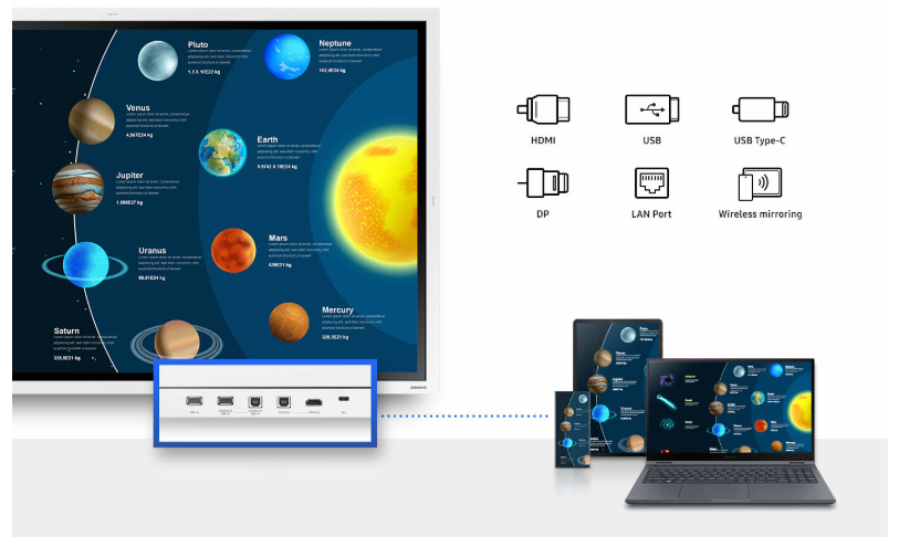 Udostępnianie treści na 85-calowym ekranie jest intuicyjne i szybkie. Funkcja SmartView+ pozwala na bezprzewodowe podłączenie nawet 50 urządzeń, umożliwiając jednoczesne wyświetlanie do czterech różnych ekranów w formacie podzielonym. To funkcja niezastąpiona przy porównywaniu danych z wielu źródeł, prowadzeniu paneli eksperckich czy podczas lekcji, gdzie nauczyciel może błyskawicznie wyświetlić prace kilku uczniów jednocześnie, zachowując przy tym pełną czytelność każdego z okien.
