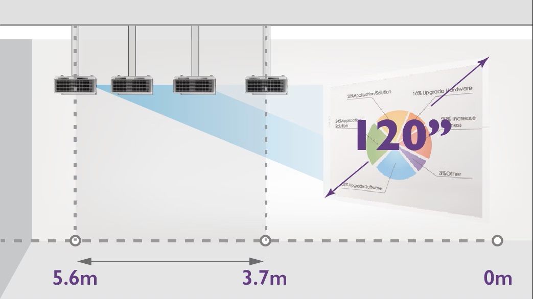 Dzięki elastycznym zakresom współczynnika projekcji i dużemu zoomowi 1,5x korporacje mogą łatwo i ekonomicznie wymienić przestarzałe projektory, wykorzystując istniejące uchwyty sufitowe do wyświetlania obrazów o dużej skali w ograniczonych przestrzeniach. Zoom 1,5x umożliwia montaż projektora SH753P w odległości od 3,7 do 5,6 metra od ekranu i wyświetlanie obrazów o przekątnej 120 cali, co jest typowym rozmiarem obrazu w korporacyjnych salach konferencyjnych, co pozwala uniknąć kosztownych przestojów w renowacji lub instalacji.