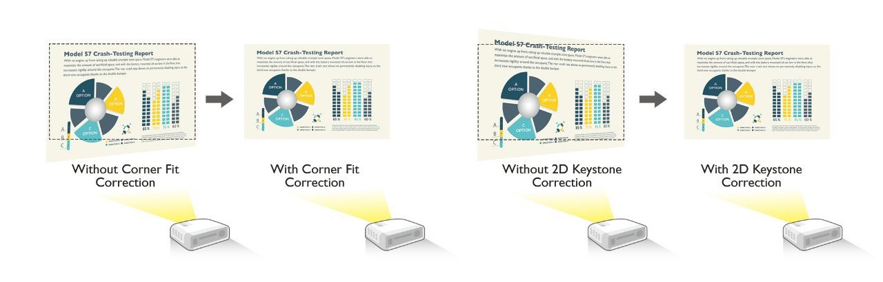 SH753P jest wyposażony w dwuwymiarowy zakres korekcji trapezu wynoszący ±30° zarówno w osi poziomej, jak i pionowej, aby przeciwdziałać efektowi trapezu, częstemu zjawisku, gdy projektor musi być zainstalowany niecentralnie. Instalatorzy mogą skorzystać z funkcji Corner Fit, aby odpowiednio dopasować każdy narożnik, aby uzyskać idealnie wyrównaną geometrię obrazu.
