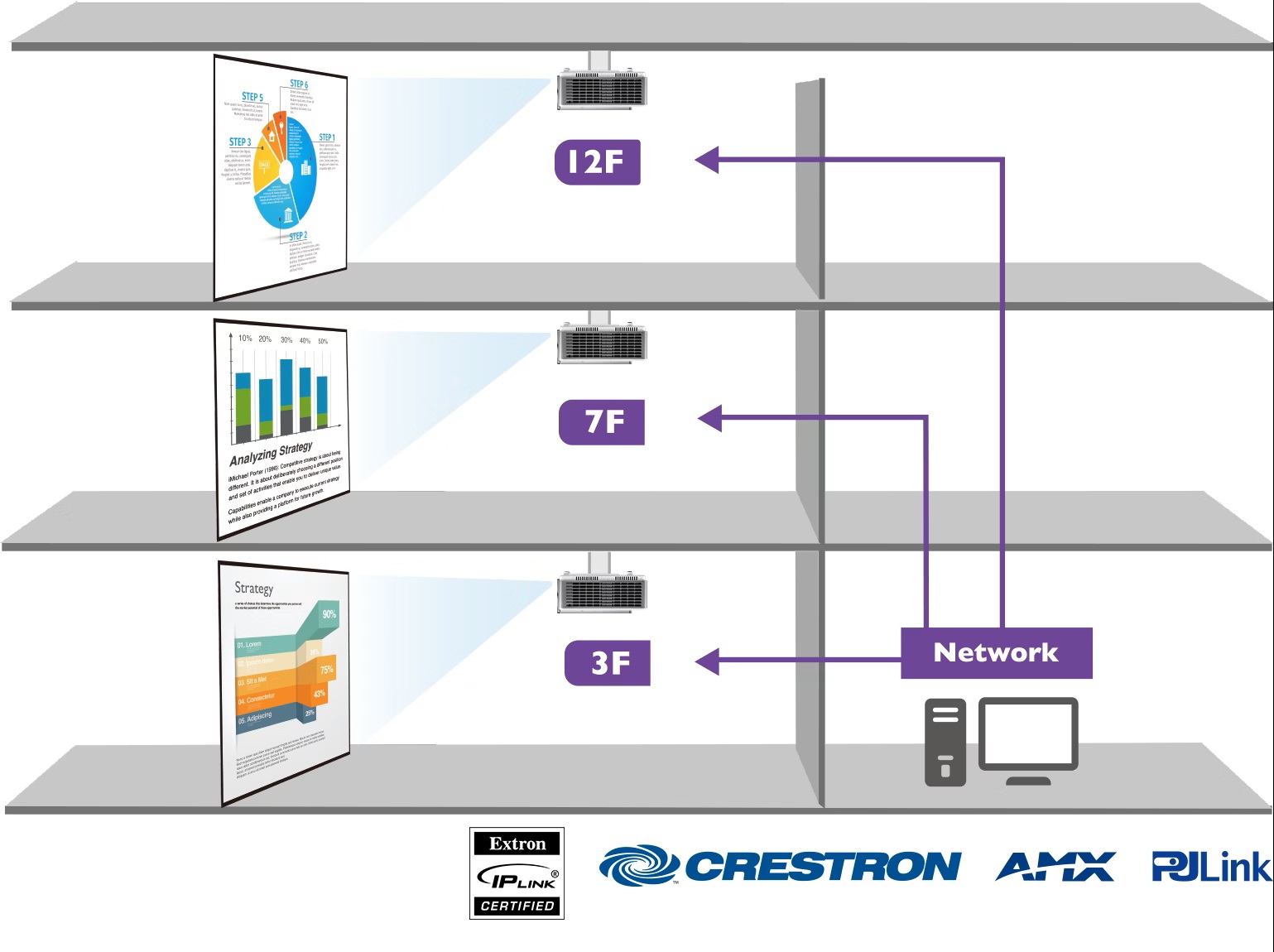 SH753P jest szeroko kompatybilny z wiodącymi systemami sterowania projektorami, w tym Crestron, AMX, Extron* i PJ-Link, które zapewniają kontrolę sieci za pośrednictwem sieci LAN, ułatwiając integrację z infrastrukturą sieci korporacyjnej. Gdy nie ma infrastruktury LAN, SH753P obsługuje również RS-232, zapewniając niezawodne instalacje na duże odległości do 15 metrów.
