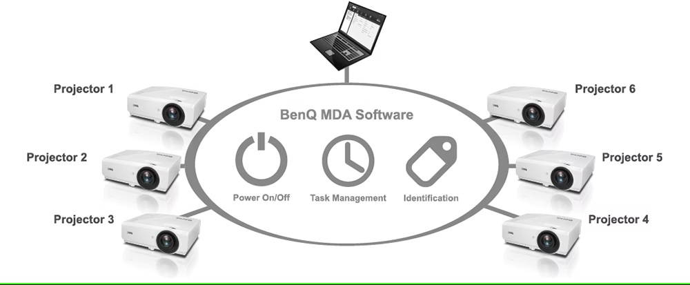Oprogramowanie BenQ Multiple Display Administrator (MDA) zapewnia wydajne, scentralizowane zarządzanie wieloma projektorami, w tym automatyczne procedury otwierania i zamykania w przestrzeniach publicznych, zdalnie sterowane włączanie i wyłączanie zasilania oraz planowanie dla instytucji i korporacji.