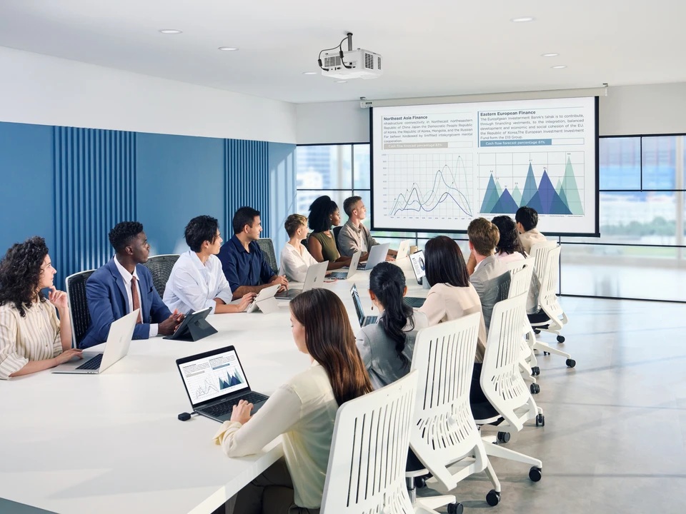 Ten łatwy w instalacji projektor pozwala na obraz o rozmiarze do 300", oferując niższy koszt za cal w porównaniu z innymi typami wyświetlaczy komercyjnych