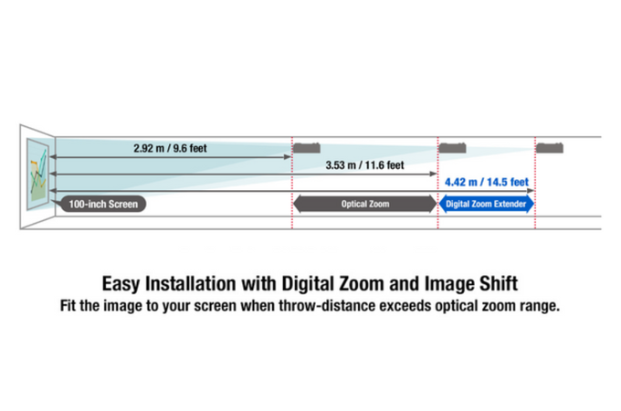 Ewolucja Digital Zoom Extender dzięki nowej funkcji Digital Image Shift. Digital Image Shift zapewnia wygodne obejście sytuacji, w której nie można zainstalować projektora na środku ekranu z powodu opraw oświetleniowych lub otworów wentylacyjnych klimatyzacji na suficie lub w przypadkach, gdy sufit jest zbyt wysoko. Możesz użyć pilota zdalnego sterowania, aby cyfrowo przesunąć obraz o 10% w górę lub w dół i o 10% w lewo lub w prawo, aby zmieścił się na ekranie.
