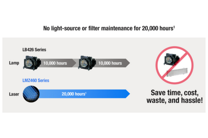 Doskonała jakość obrazu to tylko jedna z zalet projekcji laserowej. Zarówno źródła światła, jak i filtra ECO nie trzeba wymieniać do około 20 000 godzin*. Porównywalne projektory lampowe wymagałyby od jednej do czterech wymian lamp plus konserwacji filtra, gdyby działały przez ten sam czas. Nie musisz się również martwić o utylizację przeterminowanych lamp, a filtr ECO można myć i ponownie wykorzystywać, zmniejszając ilość odpadów. Nie sposób nie zauważyć, że projekcja laserowa zmniejsza koszty i problemy związane z konserwacją. A dzięki kontrolowanej szerokości jasności źródła światła i niezmiennie jednolitemu odwzorowaniu kolorów obrazy pozostają wyraźne i żywe przez znacznie dłuższy czas.