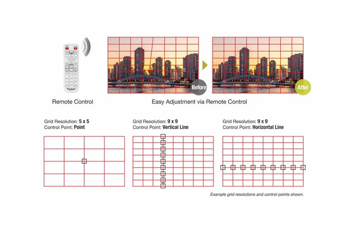 Oprócz wbudowanej funkcji regulacji geometrycznej, wolna siatka umożliwia precyzyjną korekcję lokalnych zniekształceń na ekranie. Można wybrać siatki między liniami 2 x 2 i 17 x 17, aby umożliwić korekcję punkt po punkcie, lub korekcję wsadową, określając linie pionowe i poziome. Dane korekcyjne są zachowywane nawet po zmianie liczby siatek lub punktów, umożliwiając płynne przejście od korekty podstawowej do szczegółowej. Ta wygodna funkcja umożliwia regulację specjalnych ekranów, takich jak nieregularne lub nierówne powierzchnie ścian, za pomocą pilota.