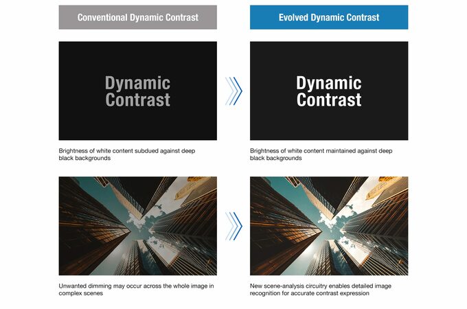 Dzięki wyższemu współczynnikowi kontrastu 25 000:1 1, Evolved Dynamic Contrast oferuje nowy obwód analizy sceny, który dokładnie wykrywa jasne i ciemne obszary, dzięki czemu różnica między czernią, bielą i kontrastującymi kolorami jest dramatycznie widoczna.