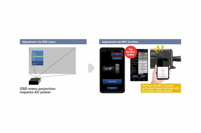Funkcja NFC1 umożliwia przygotowanie projektora do konfiguracji w miejscu zdarzenia, gdy zasilanie prądem zmiennym jest niedostępne lub projekcja OSD nie jest możliwa. Wystarczy umieścić telefon na naklejce NFC, aby się połączyć, i użyć aplikacji Smart Projector Control2 , aby dostosować ustawienia, takie jak identyfikator projektora i adres IP. Przygotuj się do połączenia sieciowego i skonfiguruj w momencie uruchomienia zasilania na miejscu, unikając opóźnień. Po zdarzeniu ustawienia projektora można zresetować do domyślnych ustawień fabrycznych po odłączeniu od zasilania, co wcześniej wymagało projekcji menu OSD.