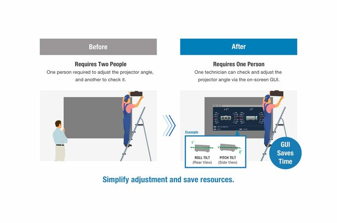 Seria RQ7 obsługuje kąty projekcji 360°, umożliwiając mapowanie obrazu na podłogach, ścianach i obiektach 3D. Jednak dostosowanie kąta projekcji do symulacji projektu może być trudne i wymaga dwóch osób. Projektory są wyposażone we wbudowany czujnik żyroskopowy, który wykrywa zmiany kąta nachylenia i przechyłu projektora, wyświetlane graficznie w menu ustawień OSD. Instalatorzy mogą regulować kąt projekcji bez konieczności pomocy.