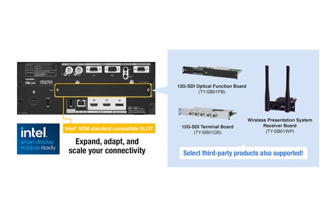 Seria RQ7 jest kompatybilna z opcjonalnymi, zastrzeżonymi kartami funkcyjnymi innych firm, które można umieścić w gnieździe SLOT zgodnym ze standardem Intel® SDM, co ułatwia adaptację, skalowanie i rozszerzanie możliwości projektora.