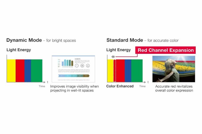 Rich Color Enhancer to oryginalna technologia 2-trybowej optymalizacji kolorów. Tryb dynamiczny równoważy jasność i kolor, zapewniając dobrą widoczność w jasnym otoczeniu. Tryb standardowy optymalizuje odwzorowanie kolorów, rozszerzając wyjście kanału czerwonego w celu uzyskania żywej czerwieni. Ma to kluczowe znaczenie dla dokładnego i wciągającego odwzorowania kompozycji i innych bogatych w kolory treści.