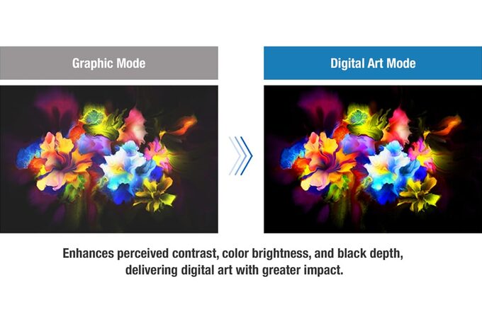 Tryb sztuki cyfrowej to nowy tryb obrazu, który optymalizuje prezentację wysokiej jakości dzieł sztuki cyfrowej w muzeach, galeriach i wciągających przestrzeniach rozrywkowych. Ten tryb pozwala łatwo poprawić jakość projekcji, kładąc nacisk na wysoki kontrast i żywe odwzorowanie kolorów, aby uzyskać bardziej efektowne wrażenia wizualne.
