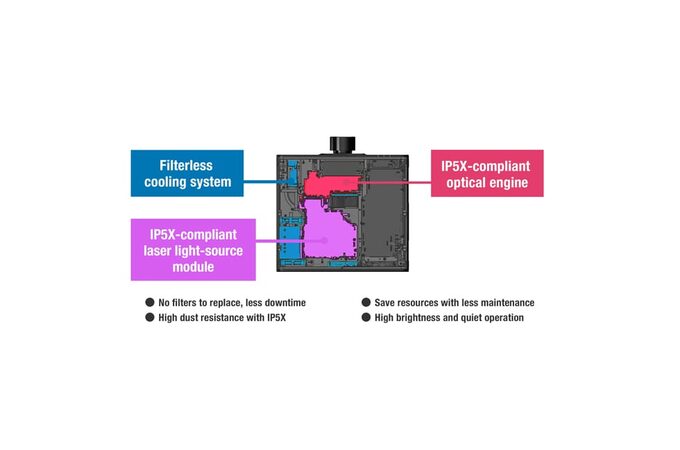Silnik optyczny i laserowe źródło światła serii RQ7 są zgodne z normą IP5X Dust Protected (IEC 60529)1 . Eliminuje to potrzebę stosowania filtra i umożliwia 20 000 godzin2 bezobsługowej projekcji. Niezawodność została potwierdzona przez przyspieszone testy w komorze pyłowej w warunkach znacznie bardziej zapylonych niż te, w których testowane są niektóre produkty konkurencji.