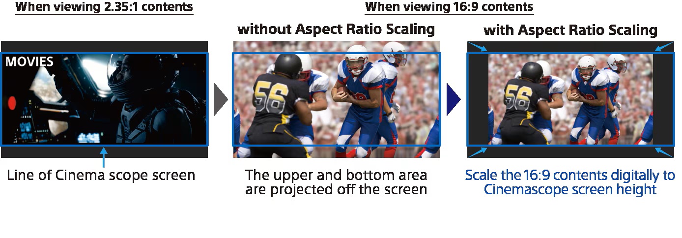 Projektor BRAVIA 7 (XW5100ES) jest wyposażony w funkcję skalowanie proporcji obrazu „Aspect Ratio Scaling”, która jest nowością w modelu XW5000ES. Pozwala to klientom korzystającym z ekranów Cinemascope na łatwe przełączanie się między formatami 2,35:1 i 16:9 w sposób cyfrowy, bez konieczności regulacji obiektywu projektora.