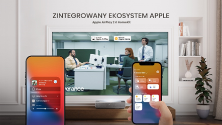 Laser TV L5H możesz połączyć ze swoim inteligentnym domem dzięki współpracy z HomeKit, a także przesyłać zdjęcia, wideo i muzykę z urządzeń Apple, dzięki Apple AirPlay 2. To pełna, wbudowana integracja z urządzeniami Apple.
