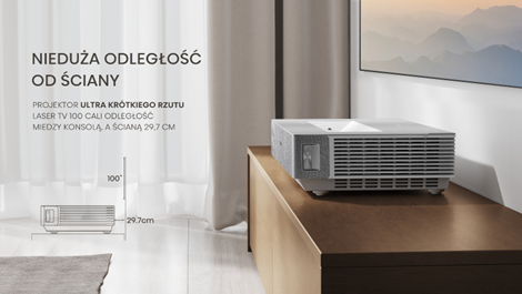 Technologia ultrakrótkiego rzutu w Hisense Laser TV L5H nie wymaga bardzo dużo miejsca na szafce, bo zaledwie 29,7 cm odległości urządzenia od 100-calowego ekranu lub w przypadku 120 cali – 41 cm. To ułatwia instalację i pozwala cieszyć się ogromnym ekranem w salonie.
